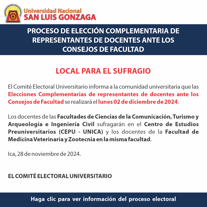 El Comité Electoral Universitario, al amparo de los Art. 117° y 118° del Reglamento General de Elecciones de la Universidad Nacional “San Luis Gonzaga”, aprobado mediante Resolución Rectoral N° 698-R-UNICA-2024, CONVOCA AL PROCESO DE ELECCIÓN COMPLEMENTARIA DE REPRESENTANTES DE DOCENTES ANTE LOS CONSEJOS DE FACULTAD DE LA UNIVERSIDAD NACIONAL "SAN LUIS GONZAGA".