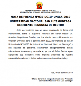 Publicado el 11 abril, 2019 por noticiasunicaRector Dr. Anselmo Magallanes Carrillo, desmiente renuncia.