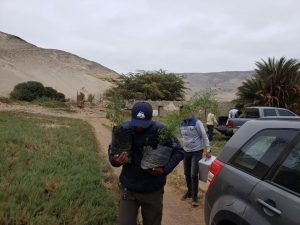 Los estudiantes de Minas y Metalurgia, llevaron plantones de huarangos a las áreas depredadas de la reserva, en un viaje por trocha durante 2:30 h a bordo de dos camionetas, llegando finalmente al área indicada por Sernamp.