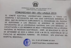 El comité electoral hace de conocimiento a los docentes y estudiantes elegidos como miembros de mesa, que la jornada de capacitación estará a cargo del personal de la ONPE este 25 de septiembre desde las 10 am en el Auditorio de la Facultad de Medicina.