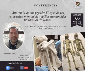 El semillero de investigación “Investigación y Progreso” de la escuela de Arqueología, facultad de Ciencias de la Comunicación, Turismo y Arqueología, organiza la conferencia virtual: “Anatomía de un fraude: el caso de las momias reptiles humanoides tridáctilos de Nasca”.