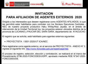📌 Afíliate y postula al servicio de PROYECTISTA, bajo contrato con los Núcleos Ejecutores Centrales – NEC del proyecto productivo Haku Wiñay/Noa Jayatai, en el ámbito de intervención de la Unidad Territorial Ica, FONCODES, los proyectos estarán ubicados distritos de la provincia de LUCANAS y PAUCAR DEL SARA SARA, departamento de AYACUCHO.