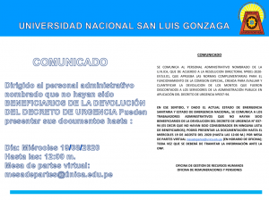 A fin de hacer público para aquel personal administrativo que NO HAYA SIDO BENEFICIARIO DE LA DEVOLUCIÓN DEL DECRETO DE URGENCIA N.º 037-94 (que no haya sido considerado en ninguna lista de beneficiarios) presente su documento hasta el miércoles 19 de agosto del 2020, hora hasta las 12:00 m.