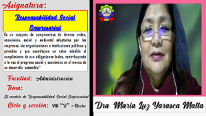 Semana n.° 3, con la Dra. María Luz Yarasca Matta, docente principal de la facultad de Administración, quien realiza su clase de la asignatura: Responsabilidad Social Empresarial, tema: «El modelo de responsabilidad social empresarial»