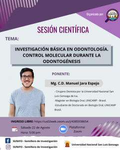 Esta Sesión Científica se realizará el sábado 22 de agosto, a partir de las 5:00 p. m. y tendrá como ponente al Mg. CD Manuel Jara Espejo.