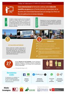 El curso tiene como objetivo fortalecer capacidades, en redacción y publicación científica, de los docentes de la UNICA en materia de investigación pesquera en los distintos eslabones de la cadena productiva y se viene desarrollando bajo plataforma on line dado la coyuntura por la pandemia.
