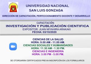 La dirección de Capacitación, Perfeccionamiento Docente y Desarrollo de la UNICA ha programado la capacitación virtual para docentes denominada: “Investigación y Publicación Científica”.