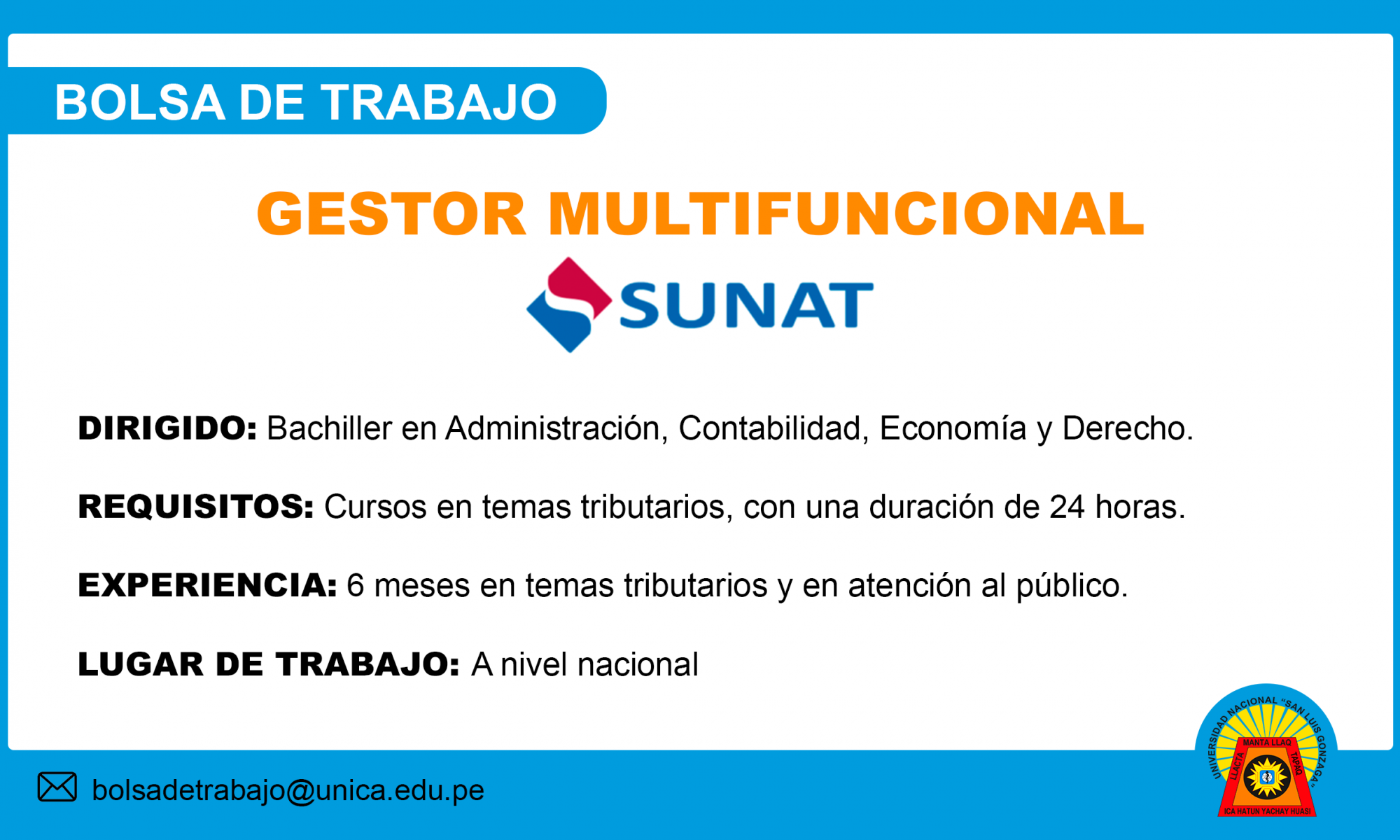 La Sunat realiza Proceso de Selección CAS, para contratar a 55 GESTOR MULTIFUNCIONAL.