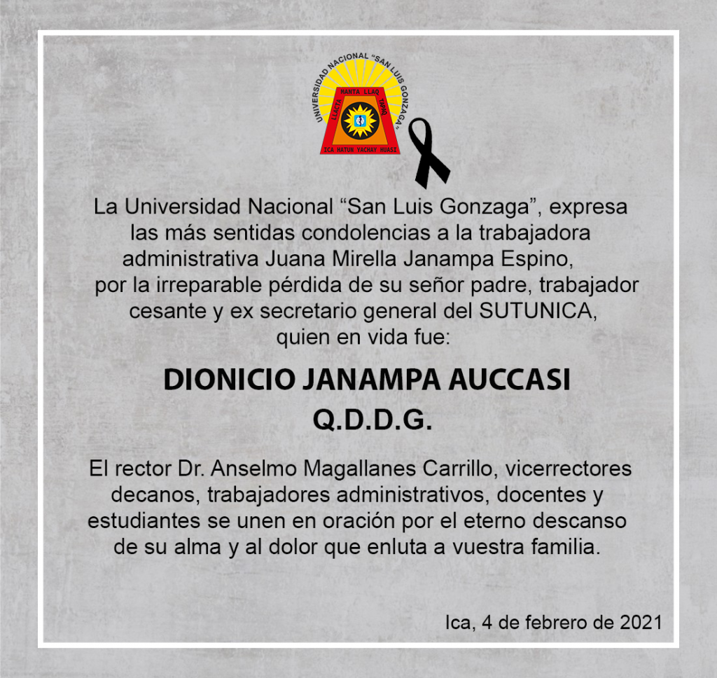 La Universidad Nacional “San Luis Gonzaga”, expresa las más sentidas condolencias a la trabajadora administrativa Juana Mirella Janampa Espino, por la irreparable pérdida de su señor padre, trabajador cesante y ex secretario general del SUTUNICA,