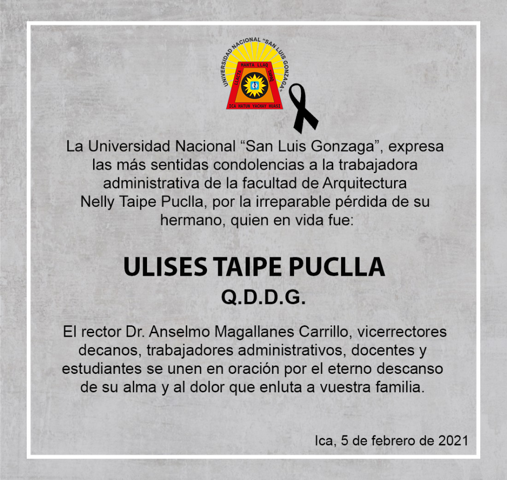 La Universidad Nacional “San Luis Gonzaga”, expresa las más sentidas condolencias a la trabajadora administrativa de la facultad de Arquitectura Nelly Taipe Puclla, por la irreparable pérdida de su