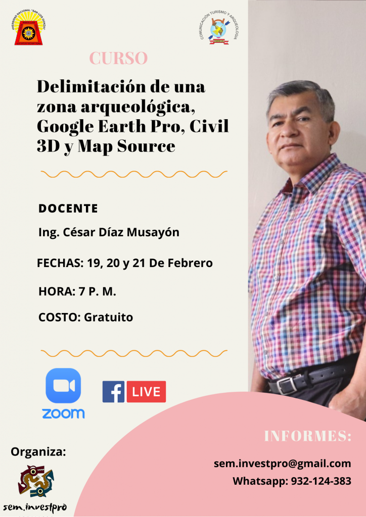 #Semilleros | El Semillero de Investigación «Investigación y Progreso» formado por estudiantes de arqueología de la Universidad Nacional «San Luis Gonzaga» de Ica, Perú, anuncia el curso: Título: “DELIMITACIÓN DE UNA ZONA ARQUEOLÓGICA, GOOGLE EARTH PRO, CIVIL 3D Y MAP SOURCE.”Docente: Ing. César Díaz MusayónFechas: 19, 20 y 21 de febrero.Hora: 7 P. M.Costo: GratuitoTransmisión vía: Zoom y FacebookLink de Inscripción: https://forms.gle/fw17Uc5XssC7Qc6w7#Arqueología#CursoVirtual#googleearth#DelimitaciónArqueologica