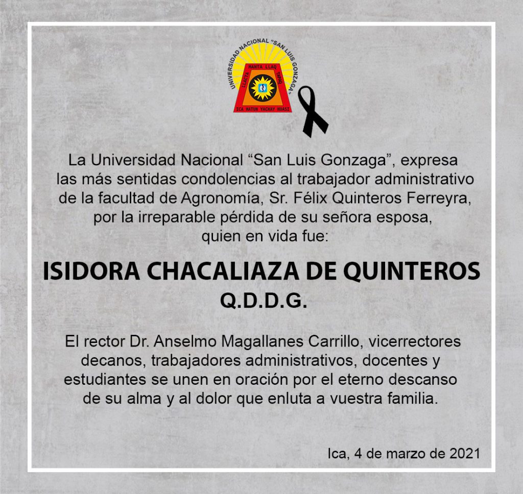 La Universidad Nacional San Luis Gonzaga, expresa las más sentidas condolencias al trabajador administrativo de la facultad de Agronomía, Sr. Félix Quinteros Ferreyra, por la irreparable pérdida de su señora esposa, quien en vida fue: Isidora Chacaliaza de Quinteros.