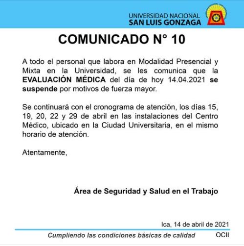 #ComunicadoSST | A todo el personal que labora en Modalidad Presencial y Mixta en la Universidad, se les comunica que la EVALUACIÓN MÉDICA del día de hoy 14.04.2021 se suspende por motivos de fuerza mayor.Se continuará con el cronograma de atención, los días 15, 19, 20, 22 y 29 de abril en las instalaciones del Centro Médico, ubicado en la Ciudad Universitaria, en el mismo horario de atención.