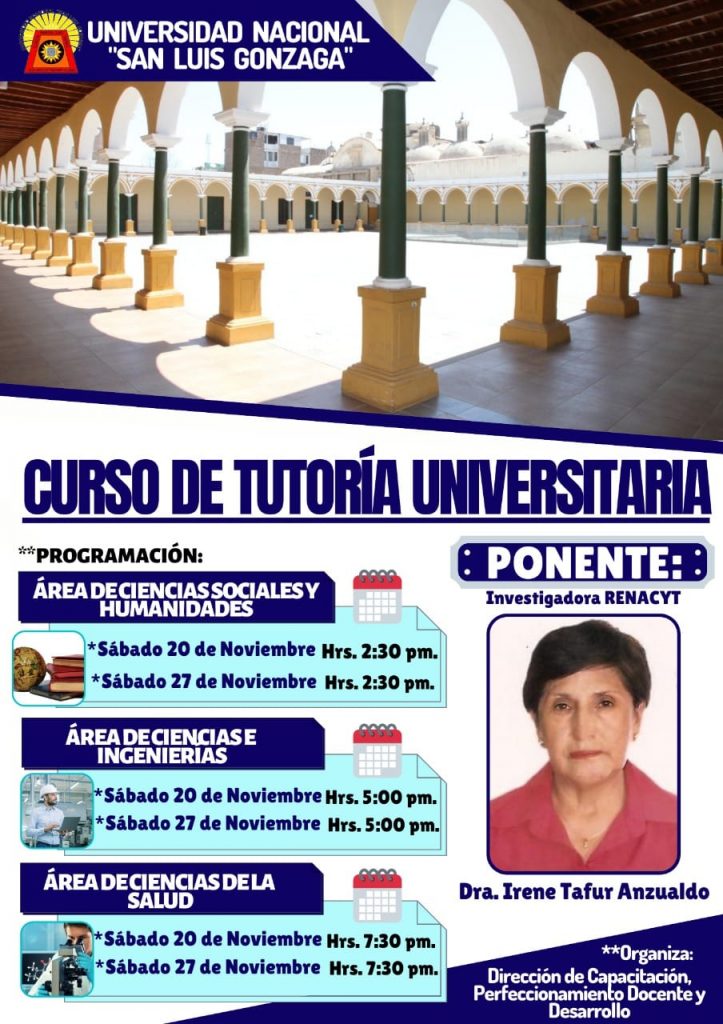 #Capacitación | La DIRECCIÓN DE CAPACITACIÓN, PERFECCIONAMIENTO DOCENTE Y DESARROLLO de la Universidad Nacional «San Luis Gonzaga» invita a todos los docentes nombrados y contratados de nuestra Alta Casa Superior de Estudios a participar del CURSO DE TUTORIA UNIVERSITARIA a realizarse el día de hoy Sábado 20 de Noviembre 2.30 p.m Área se Ciencias sociales y Humanidades5.00 p.m Área de Ciencias e Ingenierías7.30 p.m Área de Ciencias de la SaludSu participación es muy importante.Gracias por su asistencia¡UNIVERSIDAD NACIONAL «SAN LUIS GONZAGA» RUMBO AL LICENCIAMIENTO!