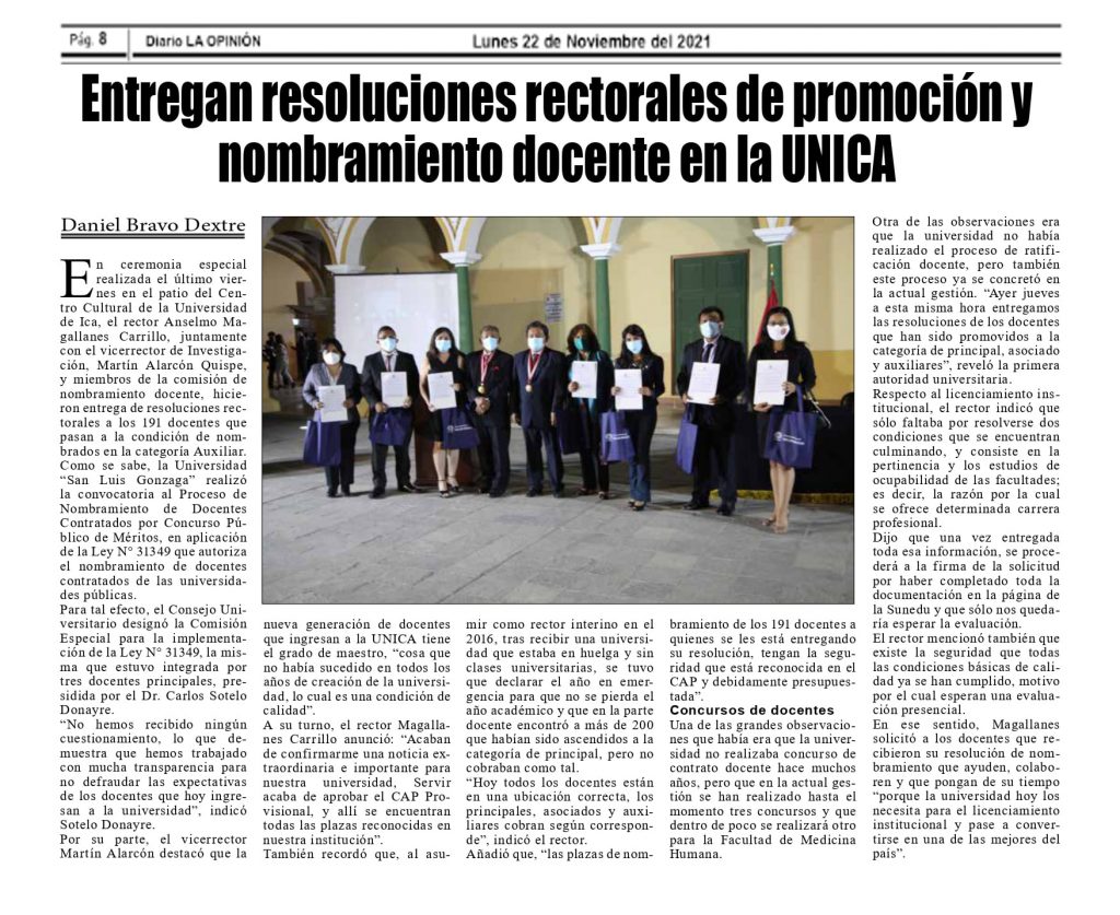 #Difusión | Diario La Opinión publica en su edición de hoy respecto a la entrega de resoluciones rectorales de promoción y nombramiento docente.