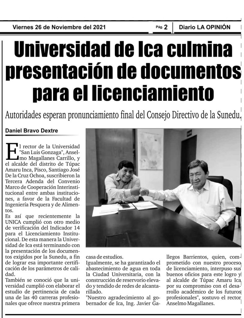 #Difusión | El diario La Opinión en su edición del 26 de noviembre destaca entrega de documentación para el licenciamiento institucional y titula la noticia de la siguiente manera, «Universidad de Ica culmina presentación de documentos para el licenciamiento».