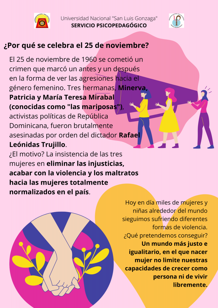 Publicado el 27 noviembre, 2021 por noticiasunica#ServicioPsicopedagógico | Día Internacional de la eliminación de la violencia contra la Mujer. ¿Por qué se conmemora el 25 de noviembre? https://www.facebook.com/UnicaSLG/posts/4568730906537419