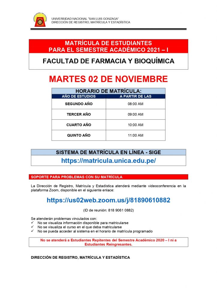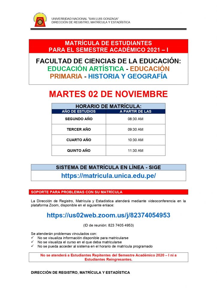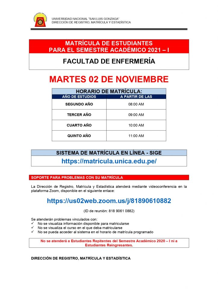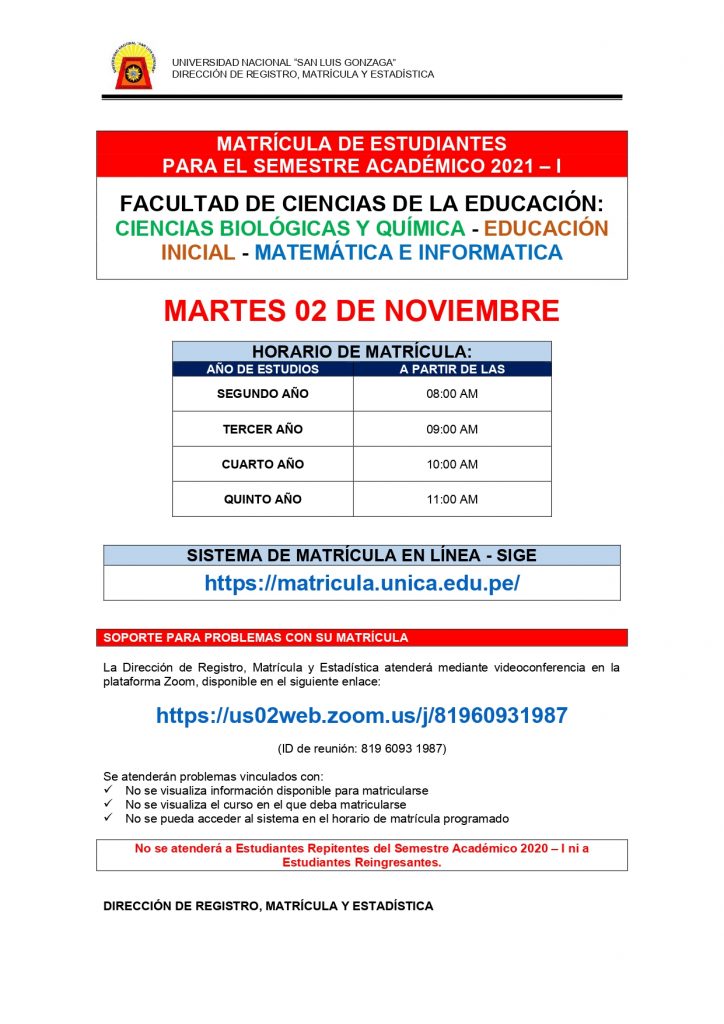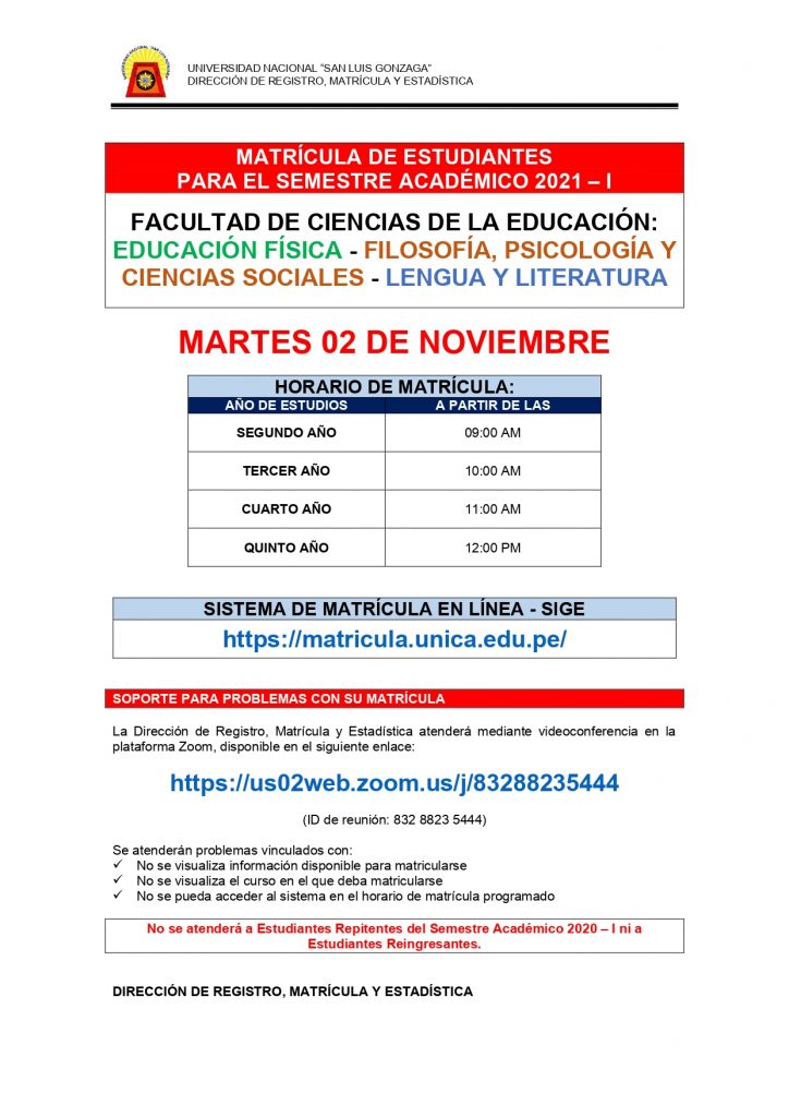 ten en cuenta los horarios para la matrícula del miércoles 03 de noviembre y la guía para el proceso de matrícula https://acortar.link/DNQp2mSISTEMA DE MATRÍCULA EN LÍNEA – SIG Ehttps://matricula.unica.edu.pe/