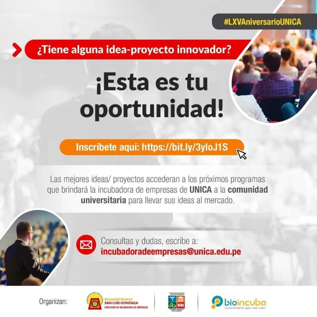 #IncubadoraDeEmpresas | ¡Atención! Estudiante de pregrado, posgrado, docente, investigador, egresado, servidor administrativo de la comunidad universitaria – UNICA. La Incubadora de Empresas y el Vicerrectorado de Investigación de la UNICA, con el respaldo de BioIncuba, la prestigiosa Incubadora de Empresas de la Universidad Peruana Cayetano Heredia, te recordamos inscribir tu idea y/o proyecto innovador que tengas!Las mejores ideas participarán de los próximos eventos de la incubadora de empresas UNICA.