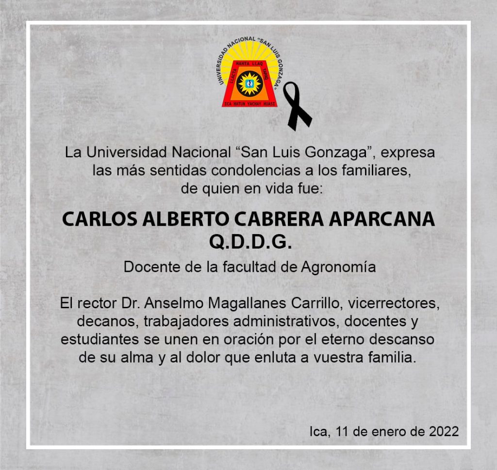 | La Universidad Nacional “San Luis Gonzaga”, expresa las más sentidas condolencias a los familiares de quien en vida fue Ing. Carlos Alberto Cabrera Aparcana.