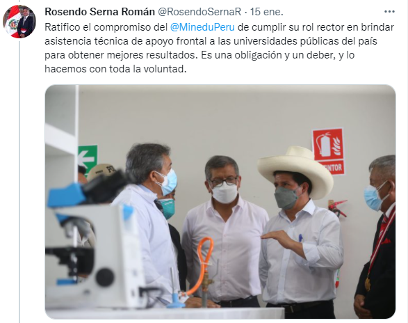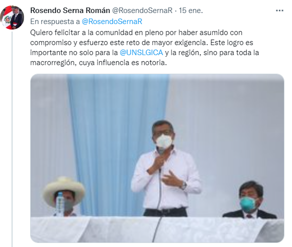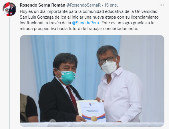 #LicenciadaSunedu | Ministro de Educación Prof. Rosendo Serna Román en su cuenta de Twitter destaca el Licenciamiento de la UNICA.