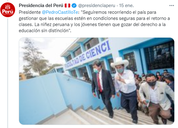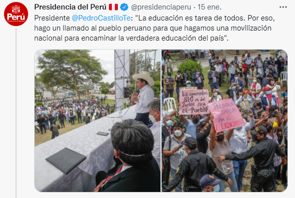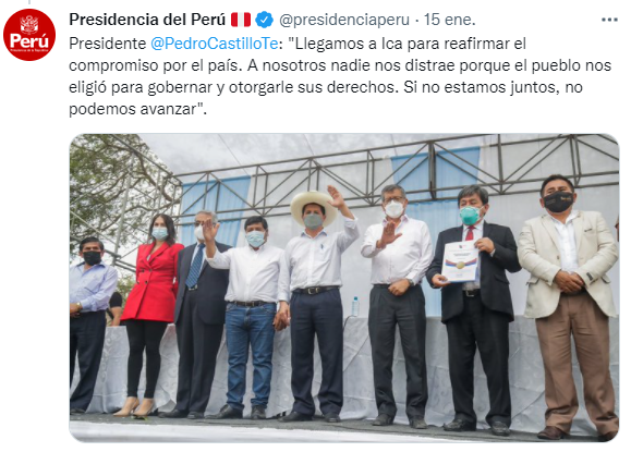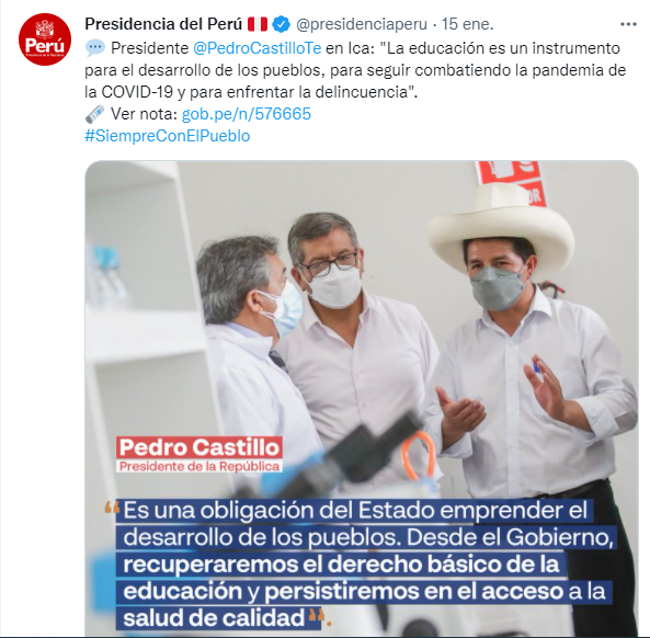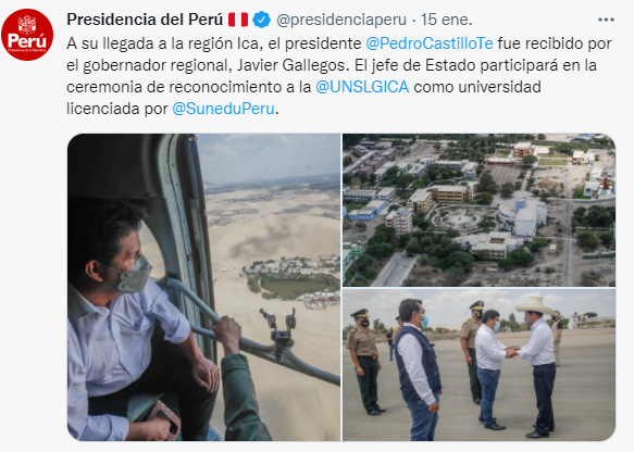 #LicenciadaSunedu | En la cuenta de Twitter Presidencia del Perú y la cuenta de Facebook Presidencia de la República del Perú informan sobre la entrega de la licencia institucional de la UNICA con la presencia del presidente Pedro Castillo.