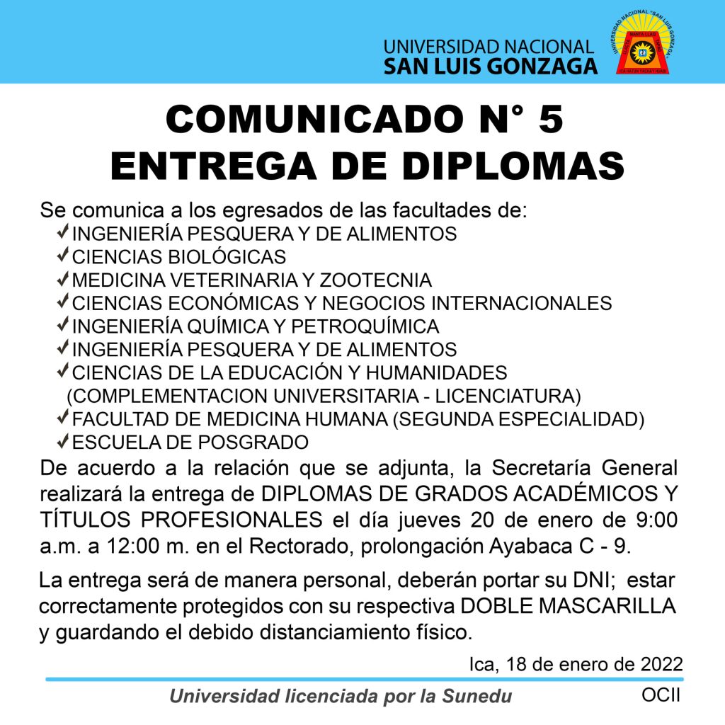 Comunicado Nº5 : Entrega de Diplomas de Grados Académicos y Títulos Profesionales.