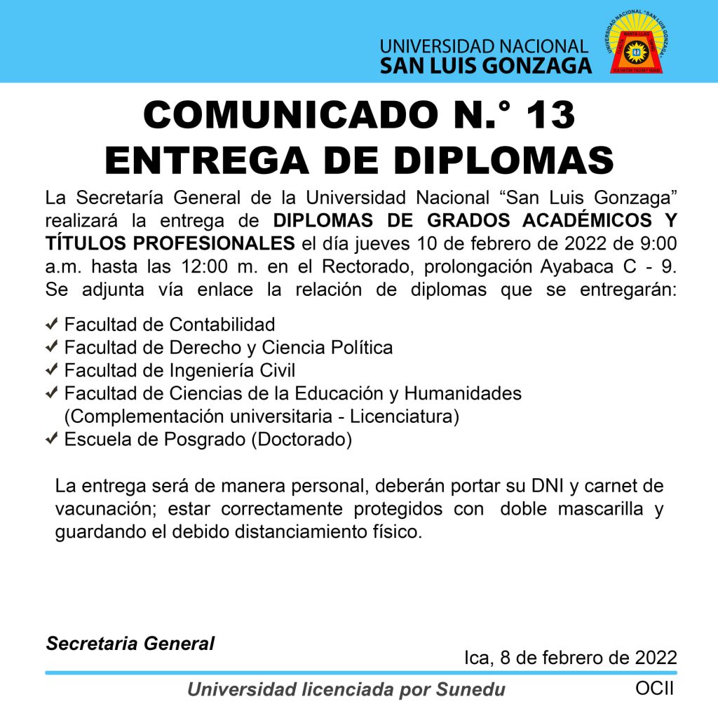 #Comunicado | La Secretaría General de la Universidad Nacional “San Luis Gonzaga” realizará la entrega de DIPLOMAS DE GRADOS ACADÉMICOS Y TÍTULOS PROFESIONALES el día jueves 10 de febrero de 2022 de 9:00 a.m. hasta las 12:00 m. en el Rectorado, prolongación Ayabaca C – 9.Relación de diplomas que se entregarán: https://acortar.link/qqpeHY