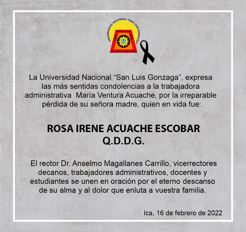 | La Universidad Nacional “San Luis Gonzaga”, expresa las más sentidas condolencias a la trabajadora administrativa María Ventura Acuache, por la irreparable pérdida de su señora madre, quien en vida fue: ROSA IRENE ACUACHE ESCOBAR.