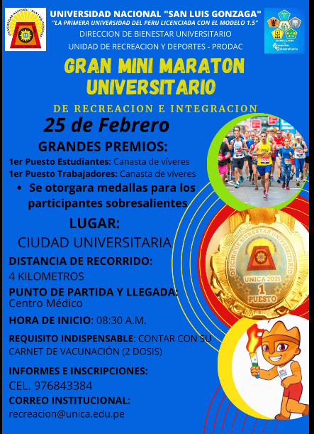 #BienestarUniversitario | La dirección de bienestar universitario a través de la unidad de recreación y deportes – PRODAC organiza la “Gran mini maratón universitario” 4K programada para este 25 de febrero en la ciudad universitaria.Informes o inscripciones al 976843384, correo institucional recreacion@unica.edu.pe
