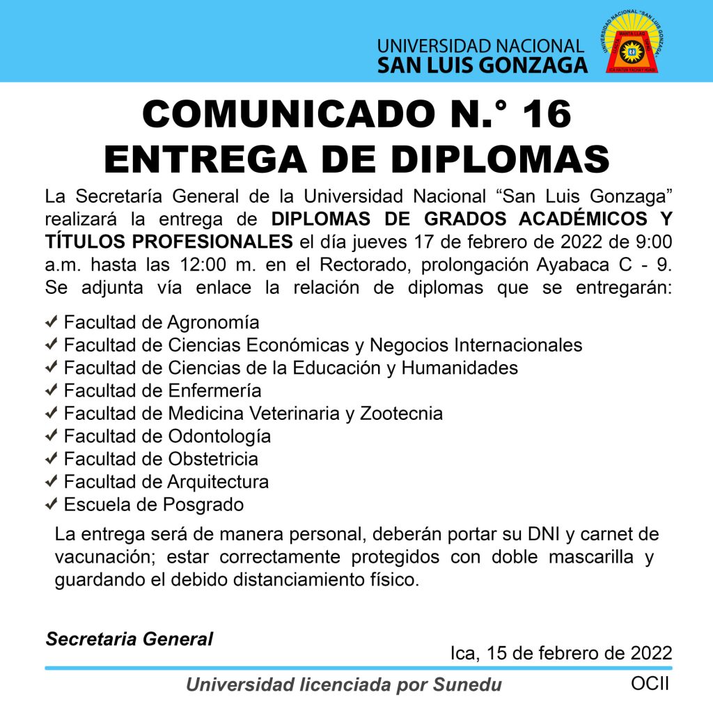 #Comunicado | Entrega de diplomas el jueves 17 de febrero de 2022.Ver relación de diplomas: https://acortar.link/jQ6JtK