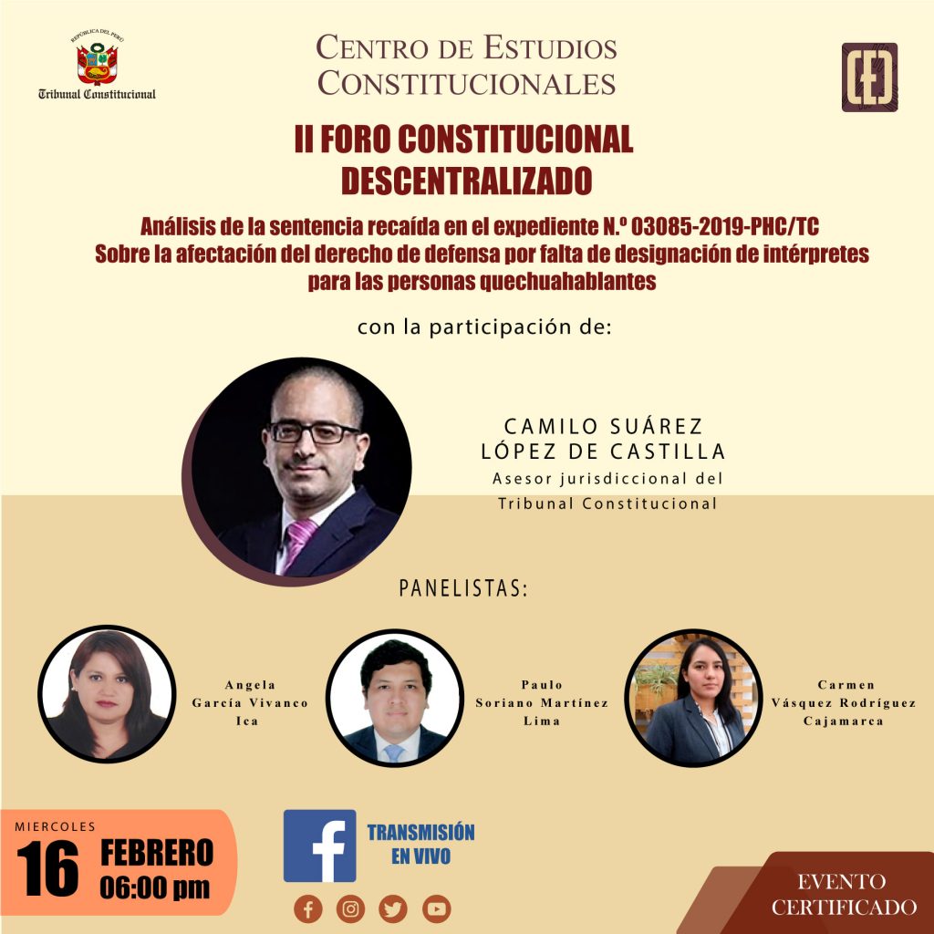 El Centro de Estudios Constitucionales (CEC) del Tribunal Constitucional (TC) invita al II Foro Constitucional Descentralizado: «la afectación del derecho de defensa por falta de designación de intérpretes para las personas quechuahablantes».![]()