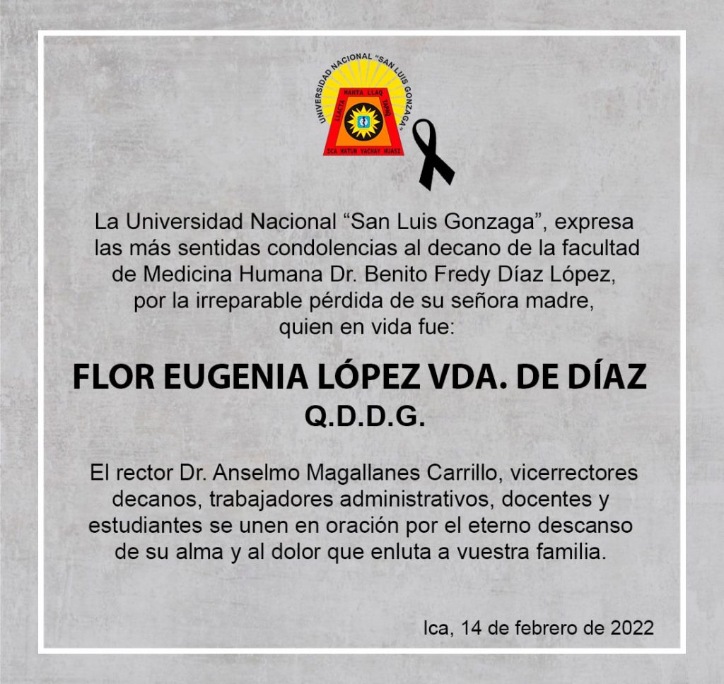 | La Universidad Nacional “San Luis Gonzaga”, expresa las más sentidas condolencias al decano de la facultadde Medicina Humana Dr. Benito Fredy Díaz López, por la irreparable pérdida de su señora madre, quien en vida fue: Sra. FLOR EUGENIA LÓPEZ VDA. DE DÍAZ