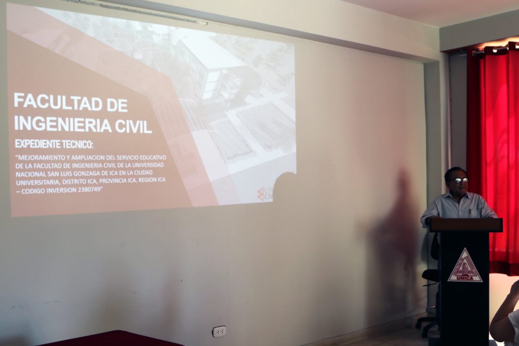 Cabe mencionar que el expediente técnico: “Mejoramiento y ampliación del servicio educativo de la facultad de Ingeniería Civil de la UNICA, con código de inversión Nº 2380749”, consta de la ampliación y mejoramiento de los siguientes bloques: Laboratorio de Estructura; Laboratorio de Hidráulica; Salas de Computación; Biblioteca; Ampliación de los bloques Administrativos, Cafetería y Formulación de conexiones de las áreas externas.