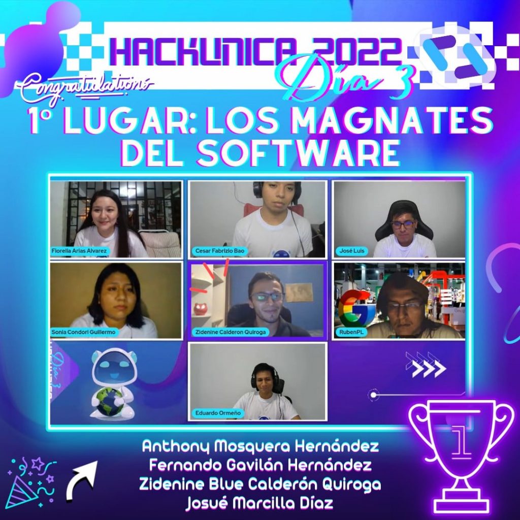: «Los Magnates del Software» , equipo conformado por Josué Marcilla Díaz, Zidenine Blue Calderon Quiroga, Anthony Leonel Mosquera Hernández y Fernando Gavilan Hernandez .