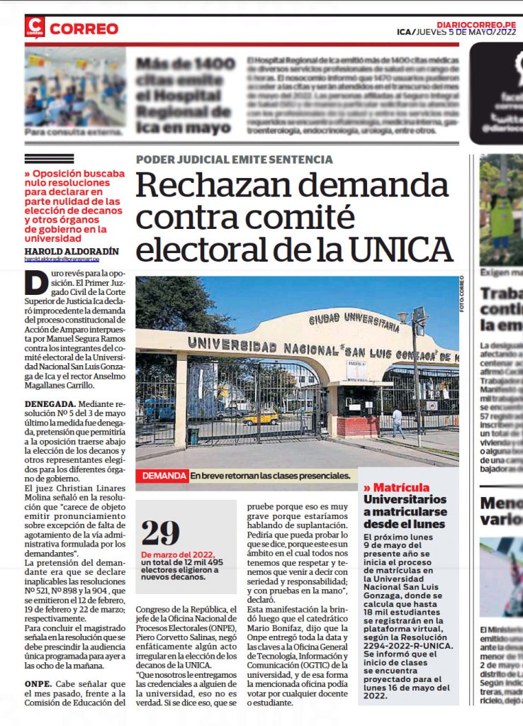 #Difusión | El diario correo Ica en su edición impresa del 5 de mayo de 2022, incluye una nota informativa referida a nuestra institución y titula: Rechazan demanda contra Comité Electoral de la UNICA.