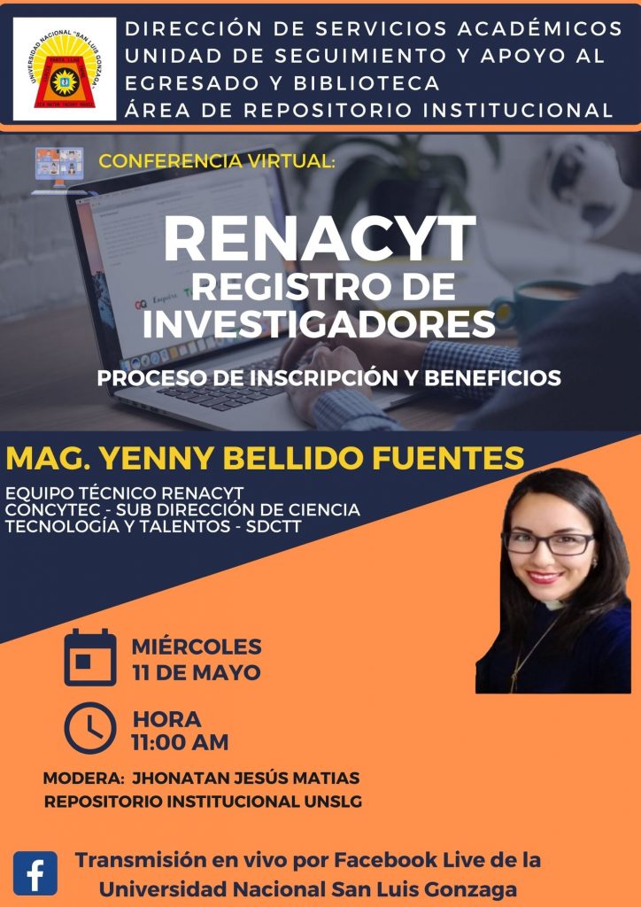 #ServiciosAcadémicos | CONFERENCIA VIRTUAL: RENACYT – REGISTRO DE INVESTIGADORES «proceso de inscripción ybeneficios»