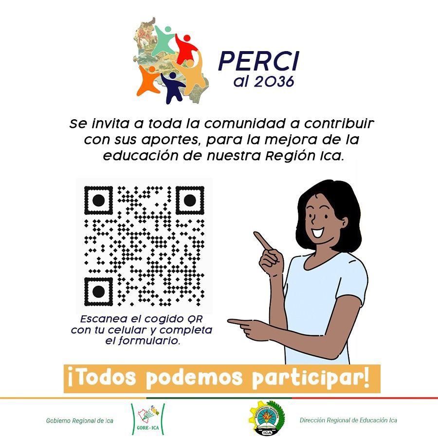 La dirección Regional de Educación de Ica invita a toda la comunidad a contribuir con sus aportes para mejorar la educación en nuestra región. Participa escaneando el código QR o completa el siguiente formulario: https://bit.ly/EncuestaPERCIal2036