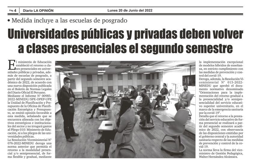 a través de la Resolución Viceministerial N° 076-2022-MINEDU se dispone que las universidades públicas y privadas, así como las escuelas de posgrado, retornen a la prestación del servicio educativo, según la modalidad autorizada en su licencia institucional, a partir del segundo semestre académico de 2022.
