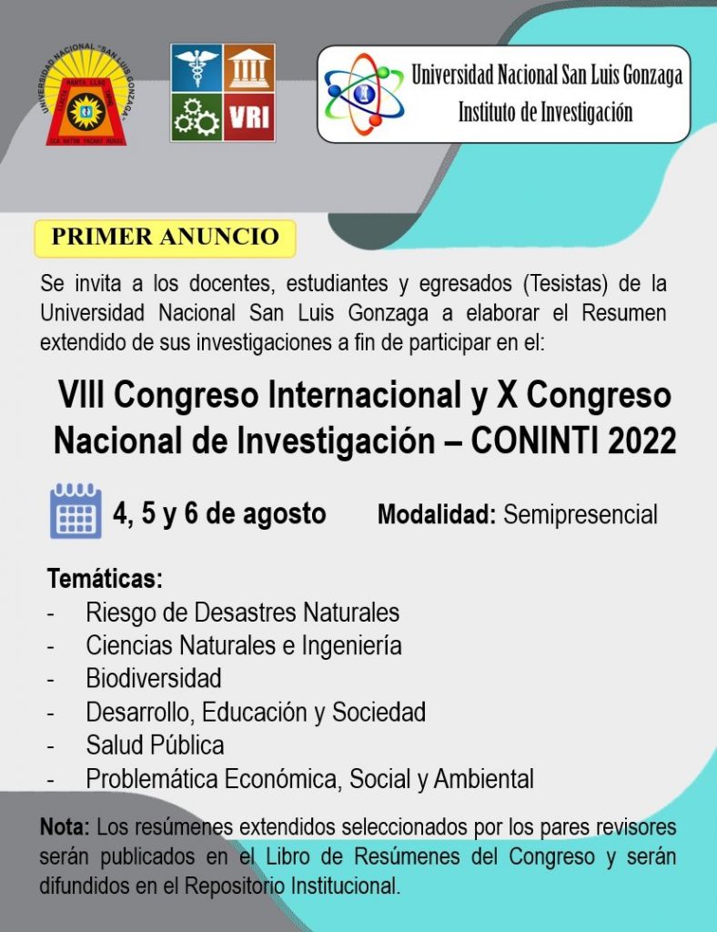 #VicerrectoradoInvestigación | Los días 4, 5 y 6 de agosto del presente se realizará el VIII Congreso Internacional y X Congreso Nacional de Investigación CONINTI 2022.