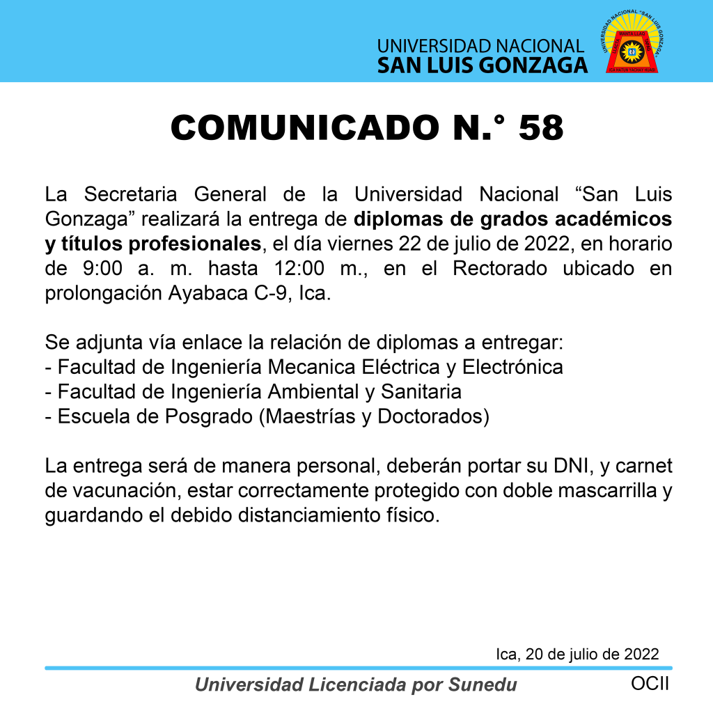 #Comunicado58 | La Secretaria General de la Universidad Nacional “San Luis Gonzaga” realizará la entrega de diplomas de grados académicos y títulos profesionales, el día viernes 22 de julio de 2022, en horario de 9:00 a. m. hasta 12:00 m., en el Rectorado ubicado en prolongación Ayabaca C-9, Ica.