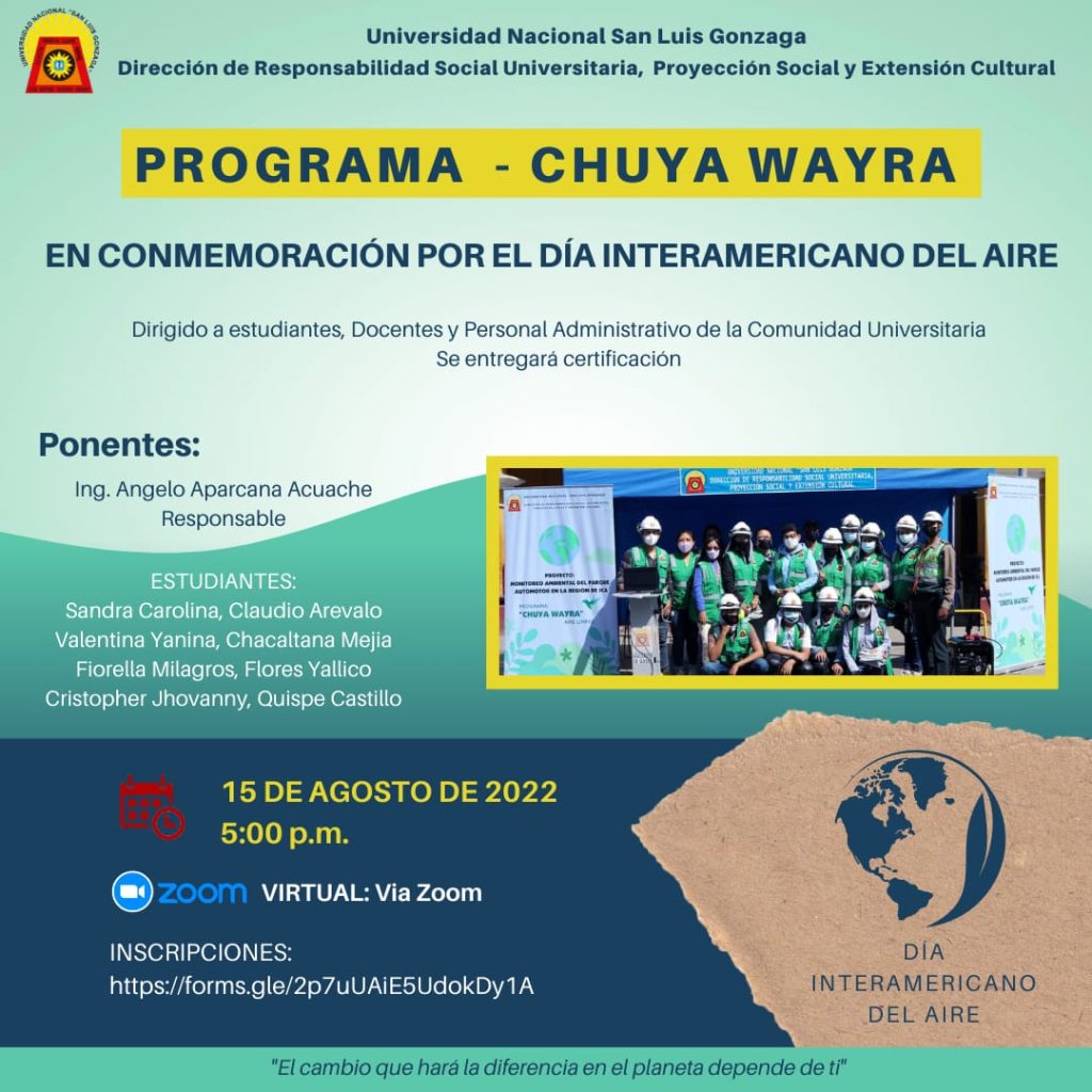 #ResponsabilidadSocialU | La Dirección de Responsabilidad Social Universitaria, Proyección Social y Extensión Cultura los invita a participar en la ponencia del Programa Chuya Wayra a realizarse el día 15 de agosto en conmemoración por el día interamericano del aire.