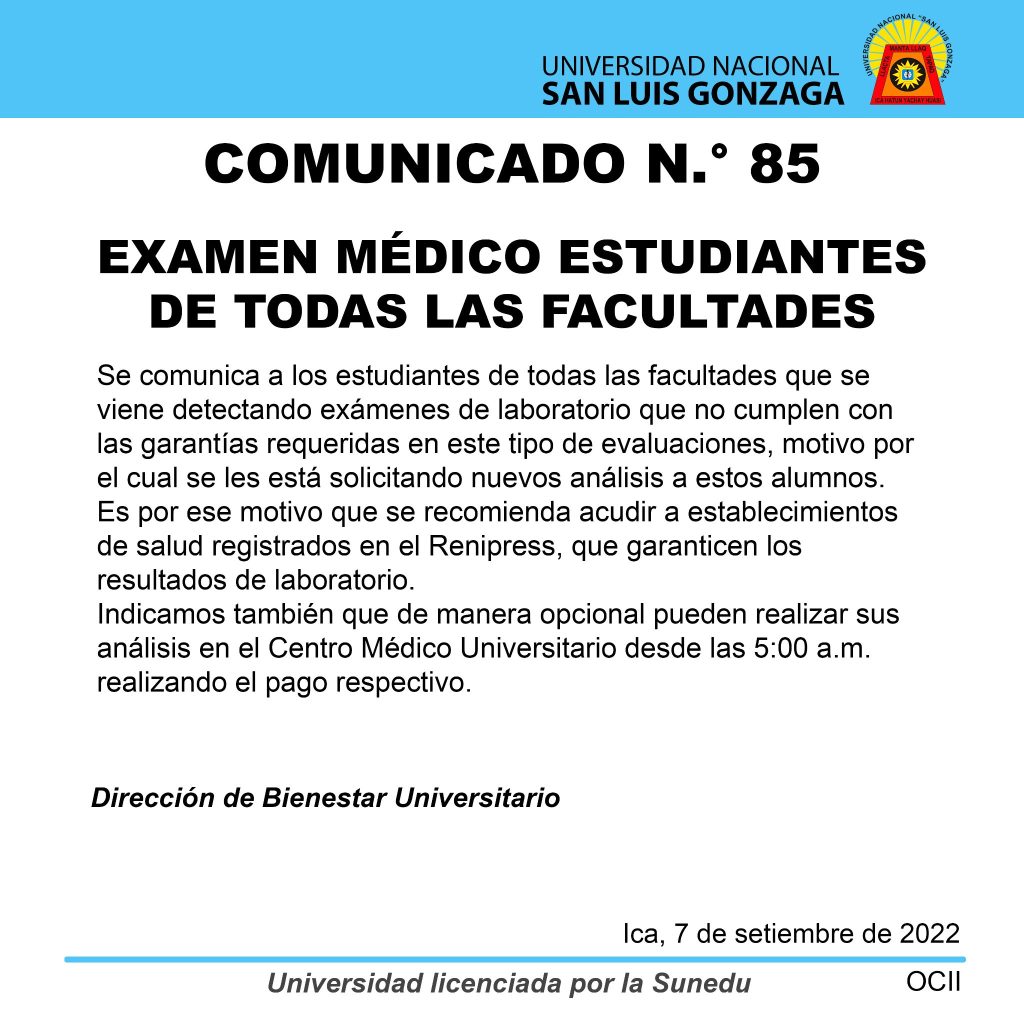 #NotaDePrensa | Bienestar Universitario. Se recomienda acudir a establecimientos de salud registrados en el Renipress, que garanticen los resultados de laboratorio. Indicamos también que de manera opcional pueden realizar sus análisis en el Centro Médico Universitario desde las 5:00 a.m. realizando el pago respectivo.