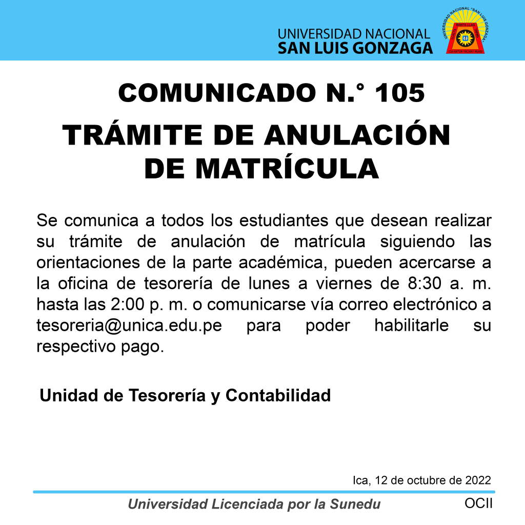 Publicado el 12 octubre, 202213 octubre, 2022 por noticiasunicaComunicado Trámite de anulación de matrícula. #Comunicado105 | Trámite de anulación de matrícula. #UnidadTesoreríaContabilidad