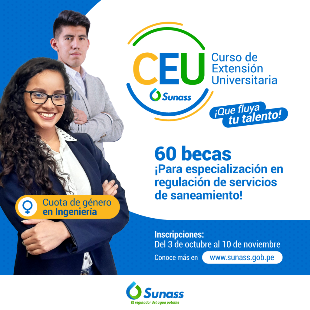#Sunass | La Superintendencia Nacional de servicios de saneamiento Sunass está ofreciendo 60 becas para el XVI Curso de Extensión Universitaria (CEU) 2023 en temas de regulación, supervisión y normatividad de los servicios de saneamiento, dirigido a estudiantes de los tres últimos ciclos y egresados (desde junio 2022) de las carreras de Derecho, Economía e Ingeniería (Agrícola, Ambiental, Civil y Química), interesados en el referido tema.