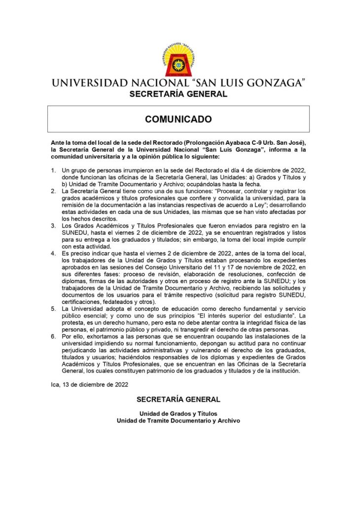 #Comunicado | Ante la toma del local de la sede del Rectorado (Prolongación Ayabaca C-9 Urb. San José), la Secretaría General de la Universidad Nacional “San Luis Gonzaga”, informa a la