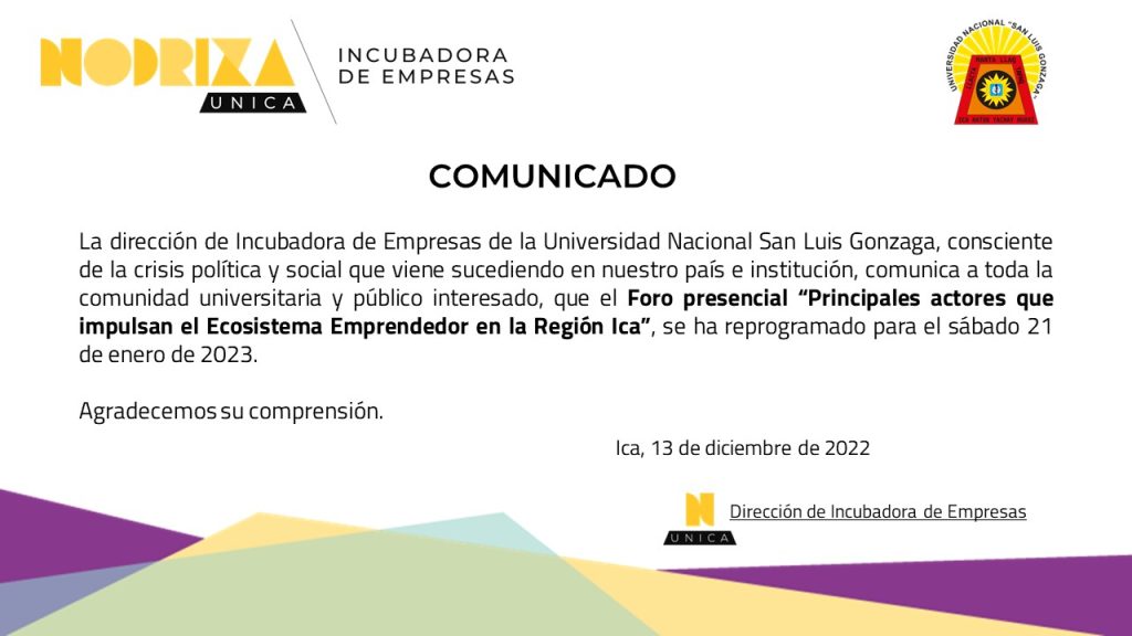 #IncubadoraUNICA | La dirección de la Incubadora de Empresas ha tomado la decisión de reprogramar el Foro presencial “Principales actores que impulsan el Ecosistema Emprendedor en la región Ica”, como parte del Networking “Evento Sideral: encuentro entre mentores y mentees”, para el sábado 21 de enero de 2023.