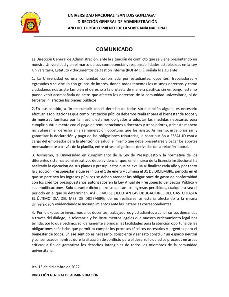#Comunicado | La Dirección General de Administración, ante la situación de conflicto que se viene presentando en nuestra Universidad, y en el marco de sus competencias y responsabilidades establecidas en la Ley Universitaria, Estatuto, y documentos de gestión interna (ROF-MOF), señala lo siguiente: