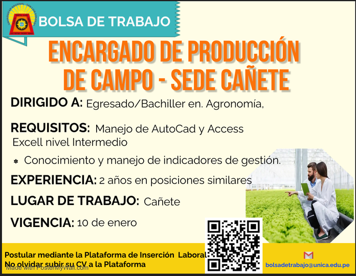 #BolsadeTrabajo | Encargado de producción de campo – sede cañete.