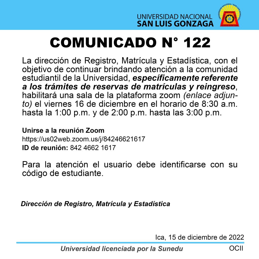 #Comunicado | La dirección de Registro, Matrícula y Estadística, con el objetivo de continuar brindando atención a la comunidad estudiantil de la Universidad, específicamente referente a los trámites de reservas de matrículas y reingreso, habilitará una sala de la plataforma zoom (enlace adjunto) el viernes 16 de diciembre en el horario de 8:30 a.m. hasta la 1:00 p.m. y de 2:00 p.m. hasta las 3:00 p.m.